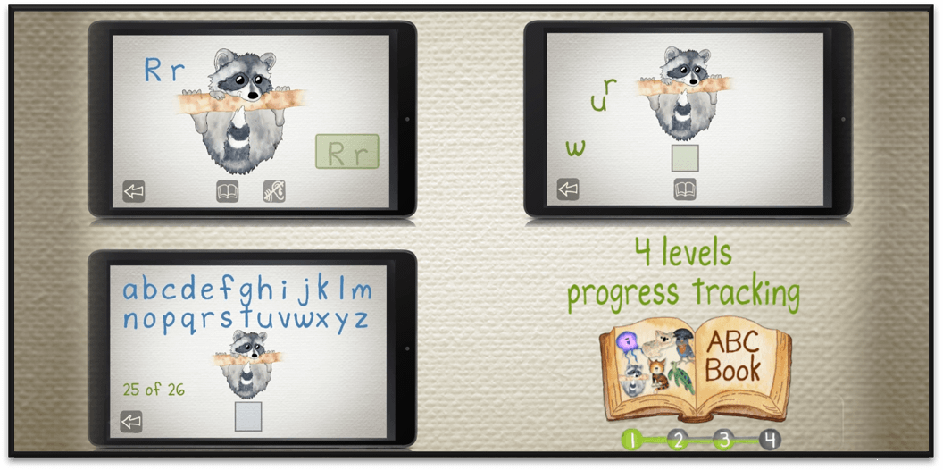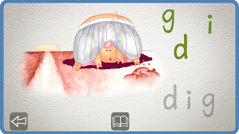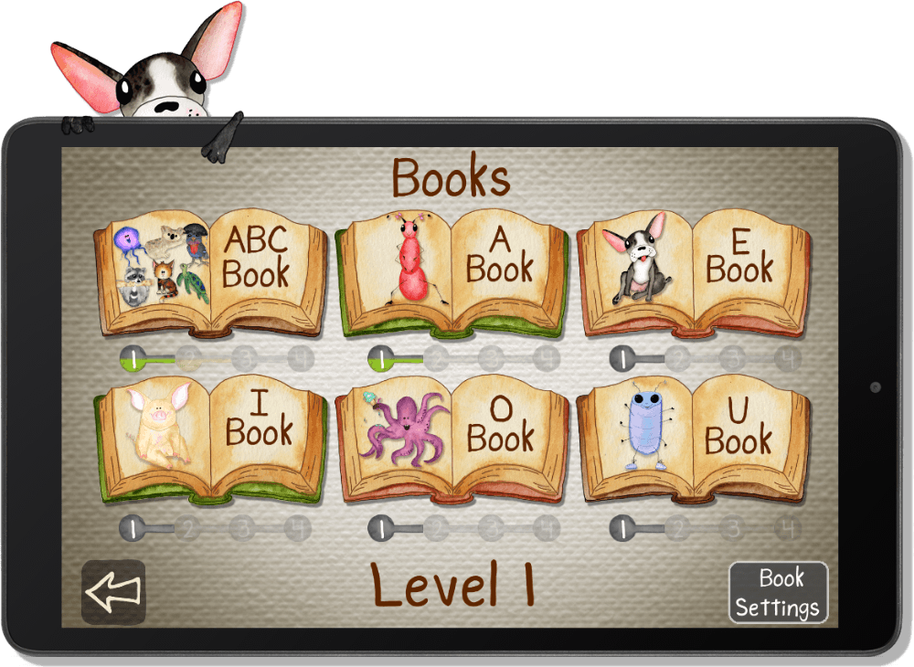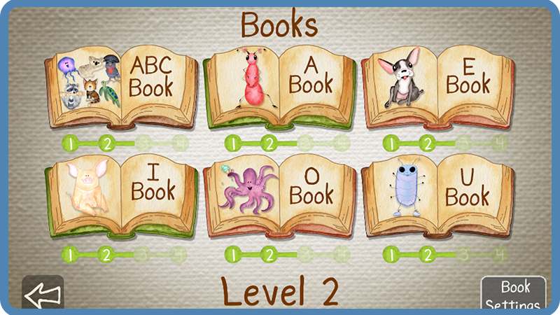 As your child completes each level for each book (there are four different levels), the next skill level is unlocked. Each level gives audible assistance when your child touches the image or touches the letters to help them complete the word.